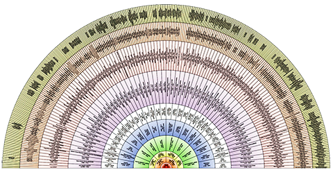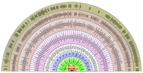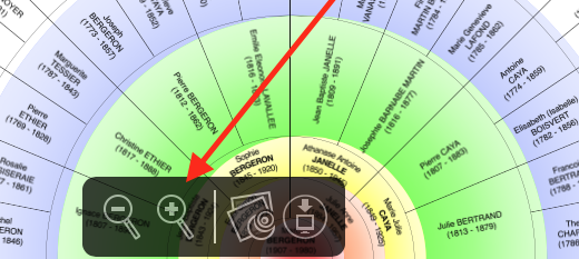 Les «roues de paon» montrant les différentes générations des familles Bergeron et Labrie.